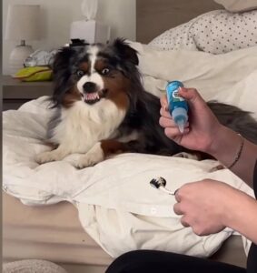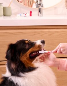 - Put a little dog toothpaste on your finger